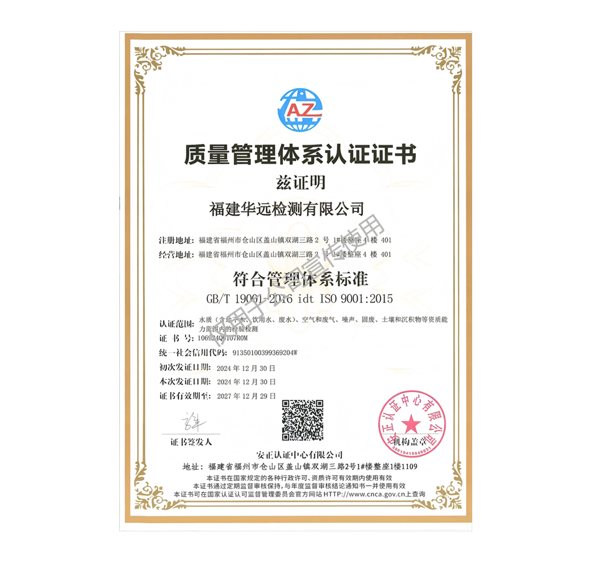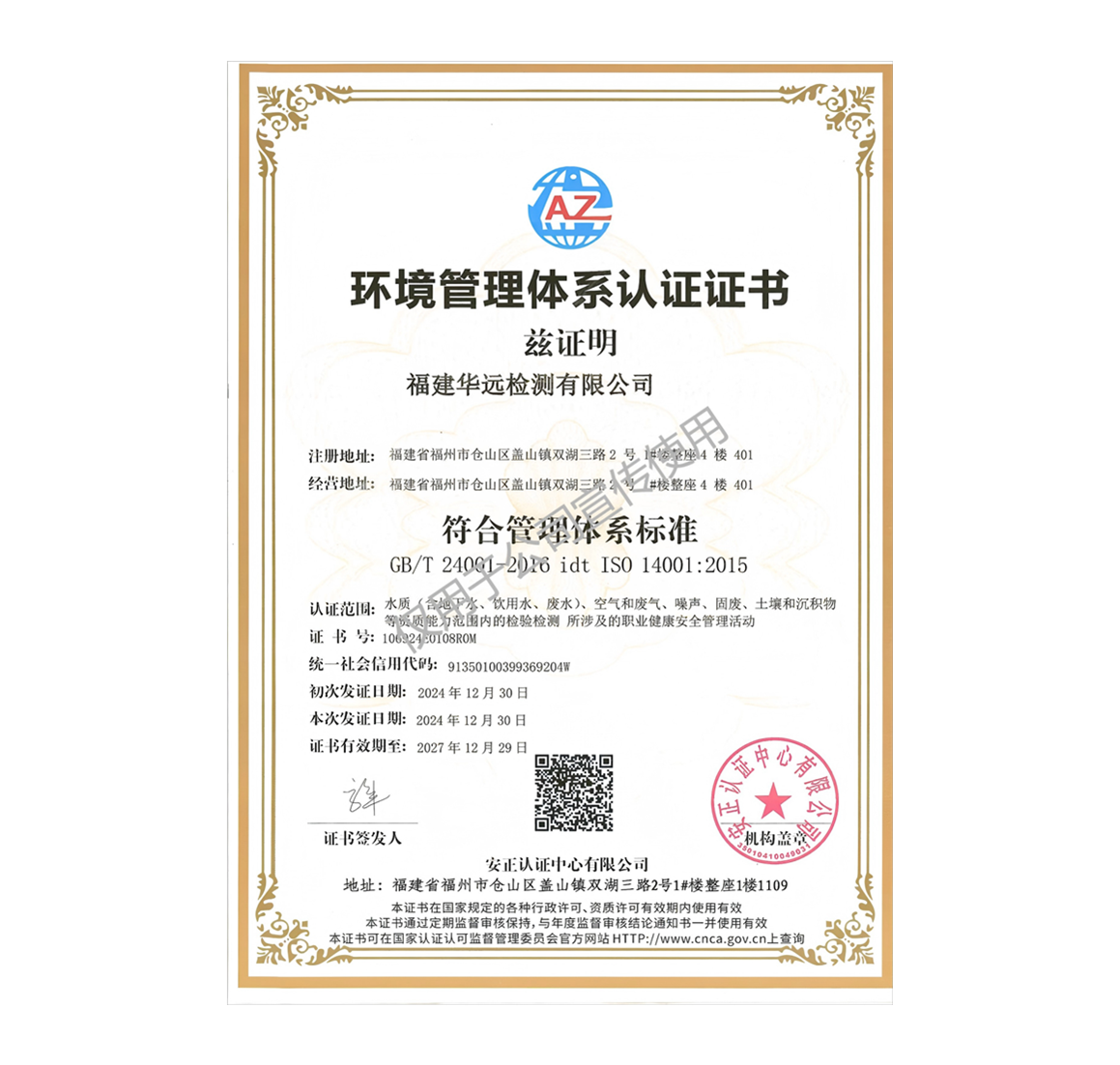 环境管理体系认证证书